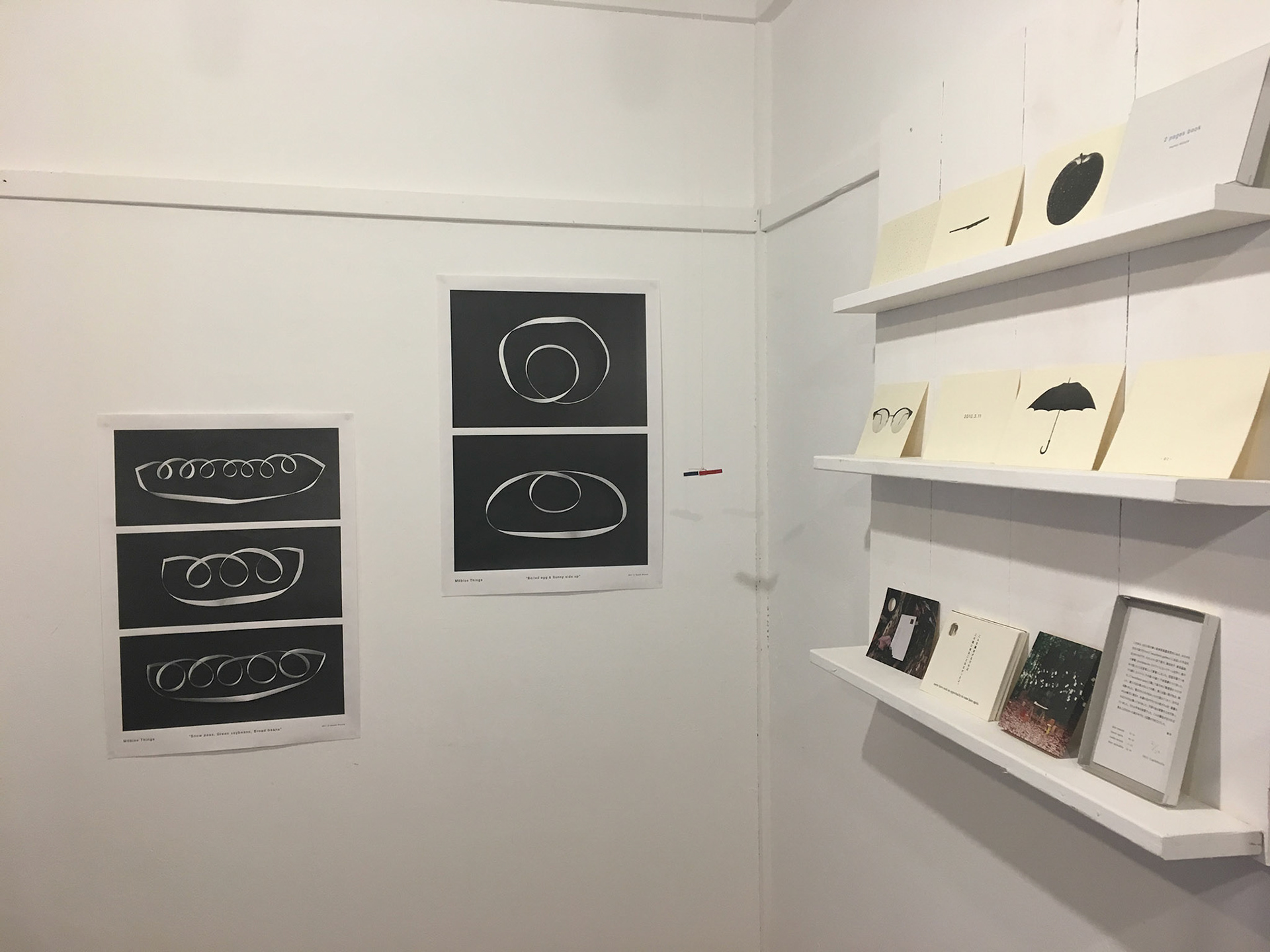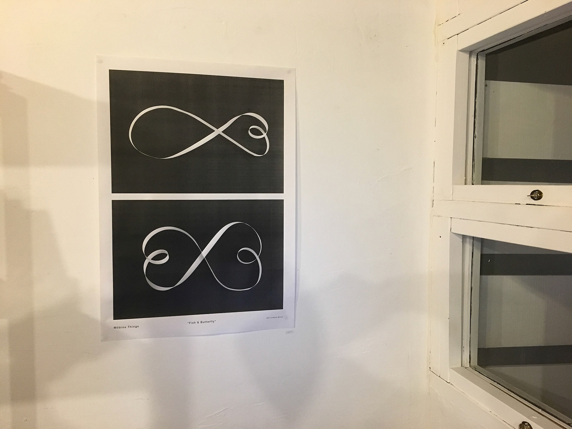 下見しに行った当時、ギャラリーは2階にあって、壁に展示をする感じだったので、ポスターをシリーズで何枚か作ろうと思いました。途中で1階のお部屋にお引越しされたので、合わせてこれまでの作品も展示させていただきました。「メビウスの生きもの」は、これまで一筆書きを書きためていたものにタイトルをつけて本や手ぬぐいなどを作っていて、今回展示に合わせて、実際にメビウスの輪で作ってみようと思い立ち、紙テープでメビウスの輪を作り、生きものたちを作って写真に撮りました。A2サイズのモノクロのポスターとB5サイズのモノクロの本を作り展示販売しました。