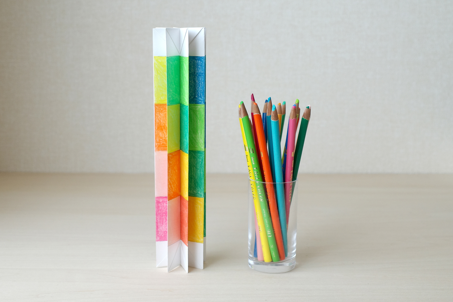 デザイナーの溝田尚子さんと一緒に折って塗ってアートブックをつくるワークショップを開催します。色鉛筆などを使った彩色とジャバラ折りのシンプルな技法を組み合わせることで、開くと自立し、さまざまに展開可能なオリジナルのアートブックをつくります。