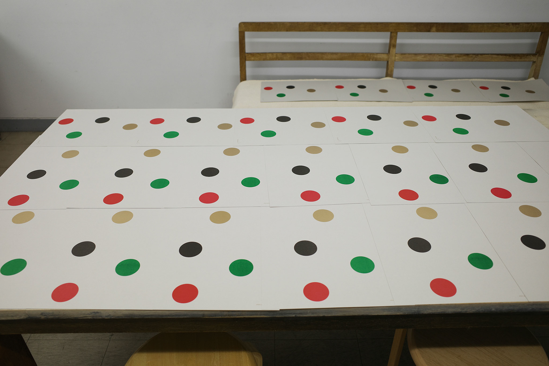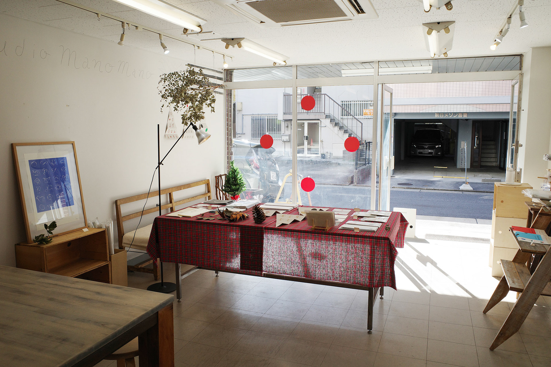 マノマノで一人でお店をやってみました。when pressのグッズと一緒に自分の作品を販売しました。2020年は世界中を覆ったウィルスによって連日世界のニュースを見ていたので、いろんな国の言葉でメリークリスマスと書いた、クリスマスのカレンダーを作りました。裏面には来年のカレンダー、先が見えない世の中で皆が無事に過ごせるといいなと思っていました。A3サイズにリソグラフで印刷し、左右を斜めにカットしてツリーのように。折り筋を入れて蛇腹折りにし、壁に貼ると立体的に影ができて面白いと思いました。この時にコロナウィルスによって多数の死者や感染者が出ていた国を意識して入れました。まあそんな意図もあるけれど、クリスマスのグッズは可愛いのがいいなと思うので、ただ可愛いを目指して作りました。(追記:この年から毎年色を変えて作っています。)